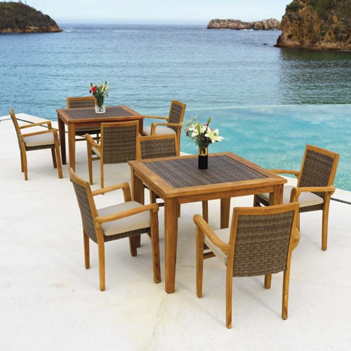 La línea de muebles de exterior Grosetto combina fascinantemente la madera teka y el tejido sintetico; otorgando belleza, durabilidad y comfort; con diseño y calidad. La teka es asiática y la fibra sintetica es de polietileno en un tono cafesoso claro.