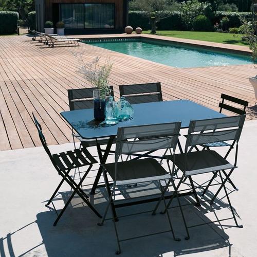 Las sillas plegables Latitude de Fermob están fuertemente construidas con acero cataforizado y malla en dos colores. Esto permite jugar con los colores, hacer combinaciones o incluso personalizar las áreas de exterior a los colores de la temporada sin tener que cambiar los muebles.